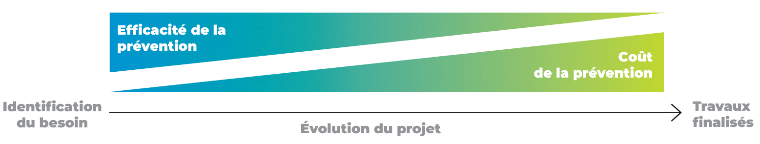 Les marges de manœuvre se réduisant au fur et à mesure de l’avancée du projet, il est primordial d’intégrer la prévention des risques au départ. Celle-ci est toujours plus efficace et moins coûteuse lorsqu’elle est intégrée dès les premières étapes d’un projet de réaménagement.