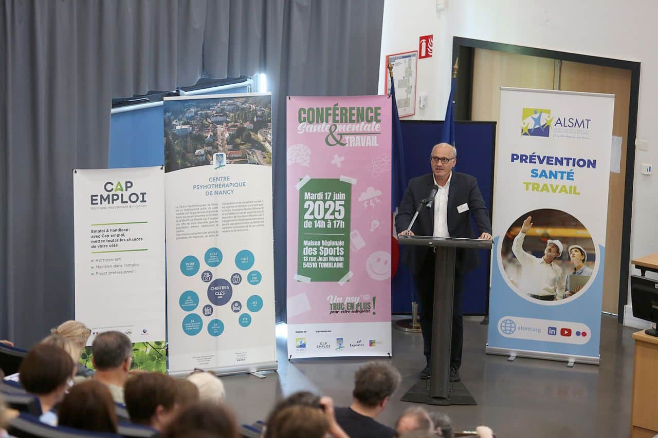 La conférence a débuté par les discours de Denis RENAUD, Directeur Général de l’ALSMT, et du Docteur Martine LÉONARD, Médecin Régional Inspecteur du Travail. Elle s’est conclue par l’intervention de Dr. Raphaël ALLUIN, Médecin référent en santé mentale à l’ARS Grand Est, venant ainsi ponctuer une après-midi riche en échanges.
